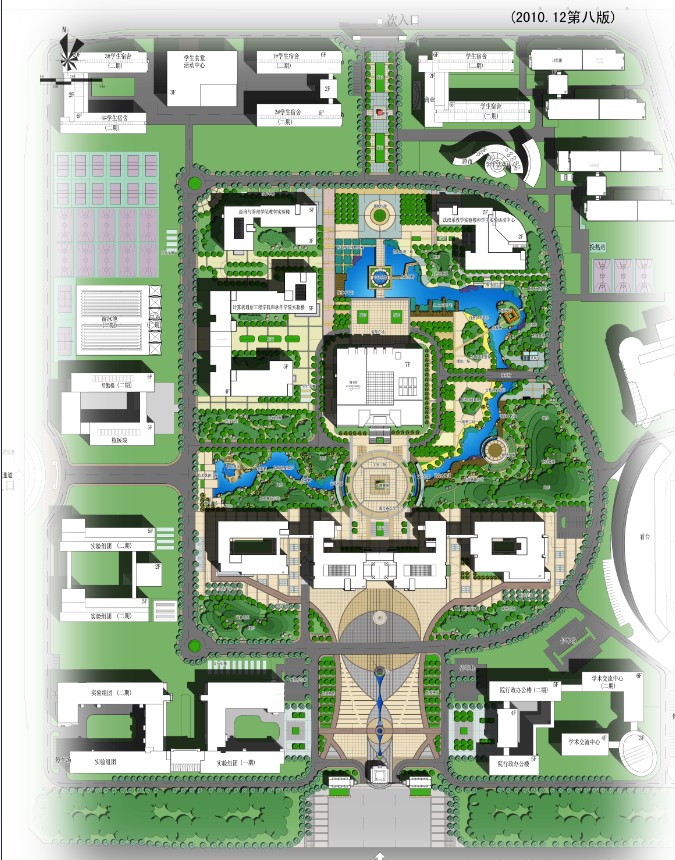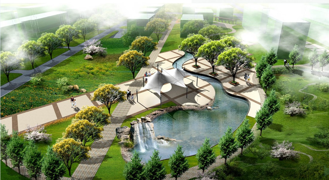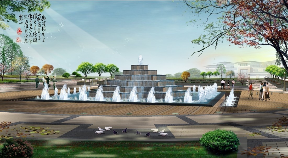 在設計總體布局中尊重場地現(xiàn)狀,環(huán)境上以“一軸一環(huán)一帶,五區(qū)十景”為景觀骨架。通過對基地特征的挖掘分析,運用現(xiàn)代景觀設計與中國傳統(tǒng)造園手法,汲取江南園林的景觀精髓,師法自然,疊山理水,達到“雖由人作,宛自天開”的境界,從整體意象上構成了一湖一溪一島的水體景觀框架。該項目將古典園林造園手法與現(xiàn)代結合,形成了中國園林特有的山水格局,形成了宜人并充滿活力的景觀空間。