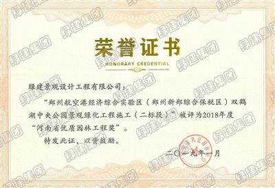 雙鶴湖二標榮獲2018年度河南省優(yōu)質園林工程獎