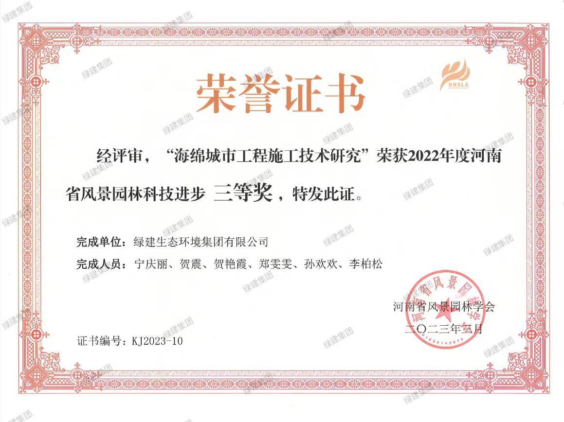 海綿城市工程施工技術(shù)研究榮獲2022年度河南省風(fēng)景園林科技進(jìn)步獎(jiǎng)三等獎(jiǎng)